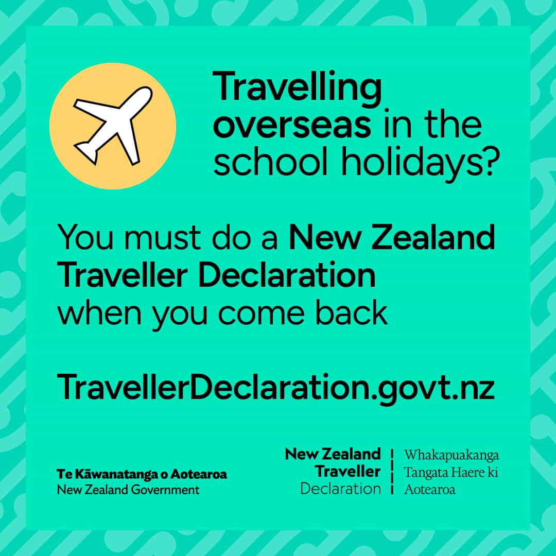 Going overseas for the school holidays? Everyone travelling into New Zealand must complete a New Zealand Traveller Declaration, including returning New Zealand passport holders.