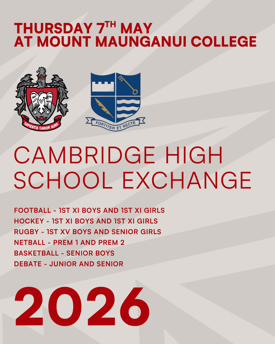 In week 3 and 4 we welcome Cambridge High School and Lynfield College for our traditional exchanges, we look forward to these exchanges and seeing a number of teams in action.